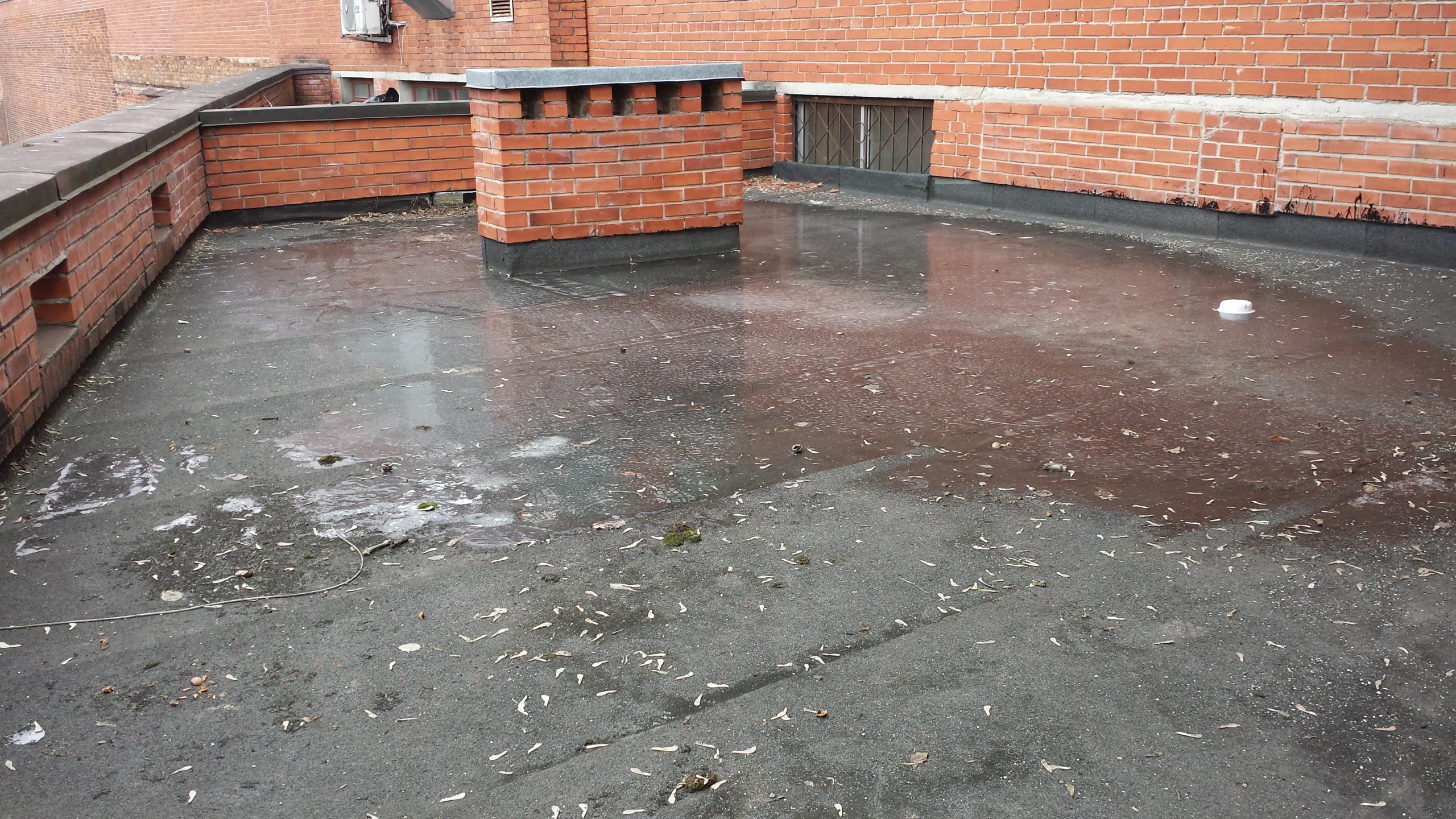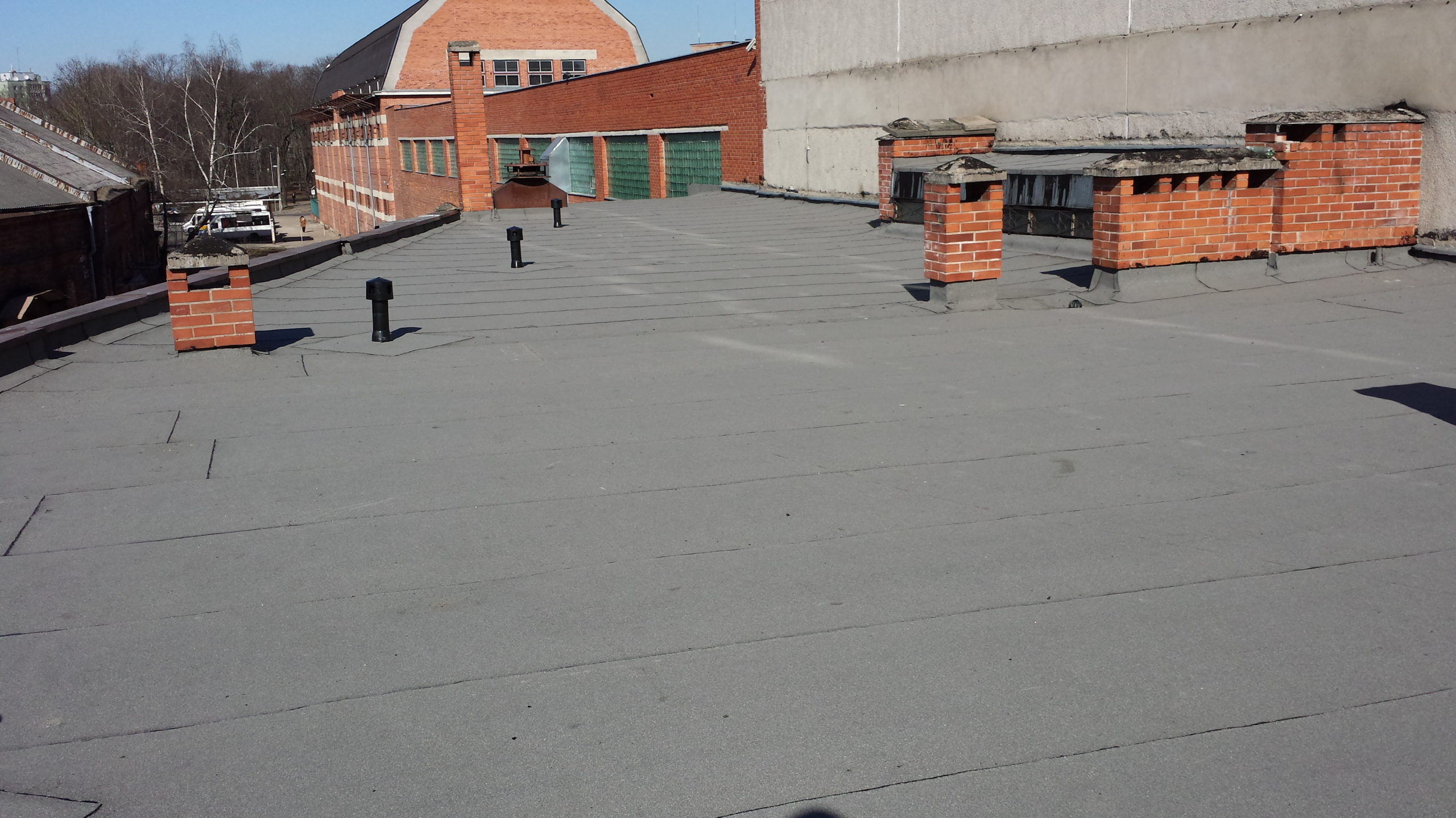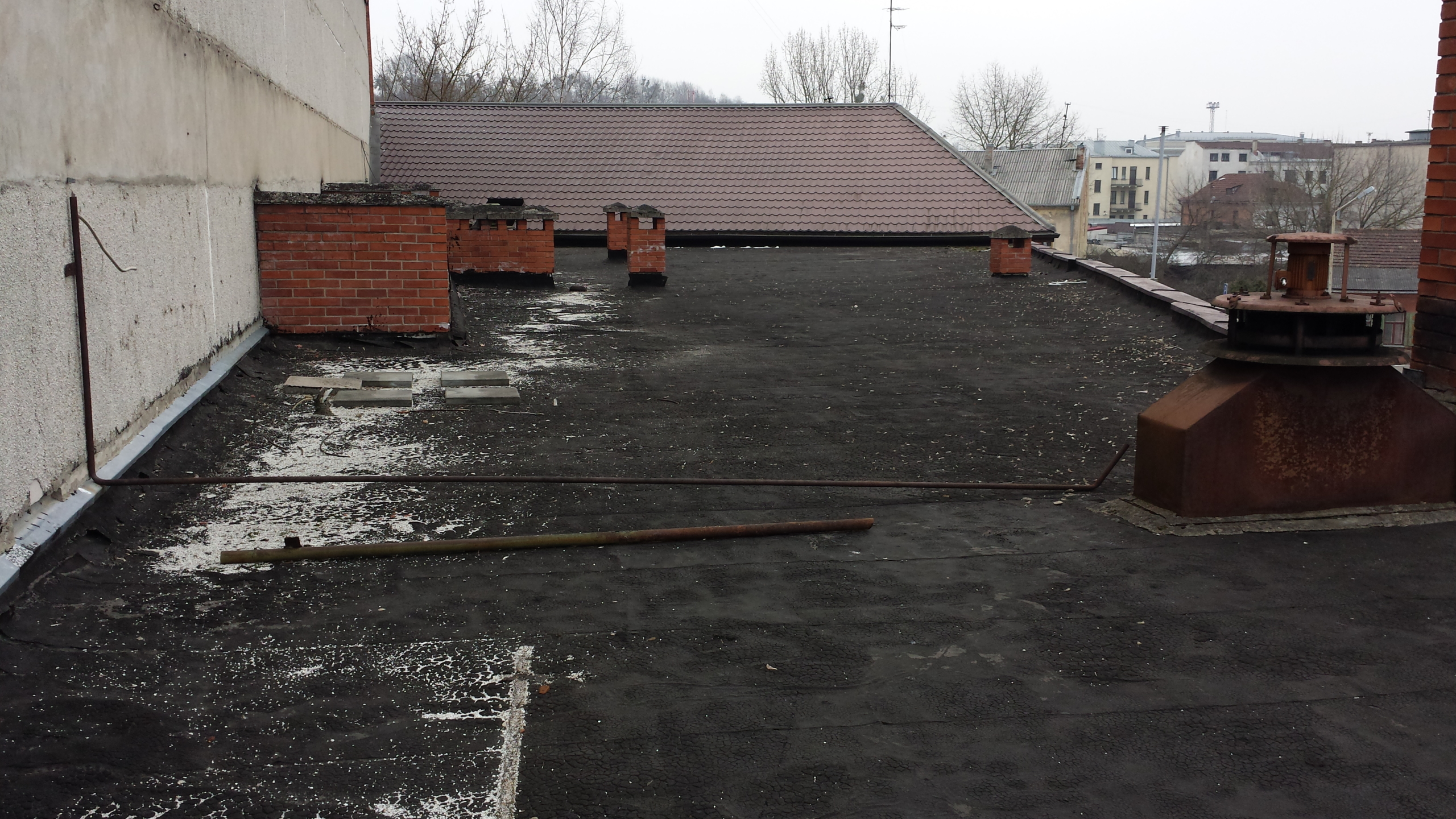 Atliekami stogo remonto-įrengimo darbai: sutapdintų ir plokščių stogų dengimas prilydoma dangą.