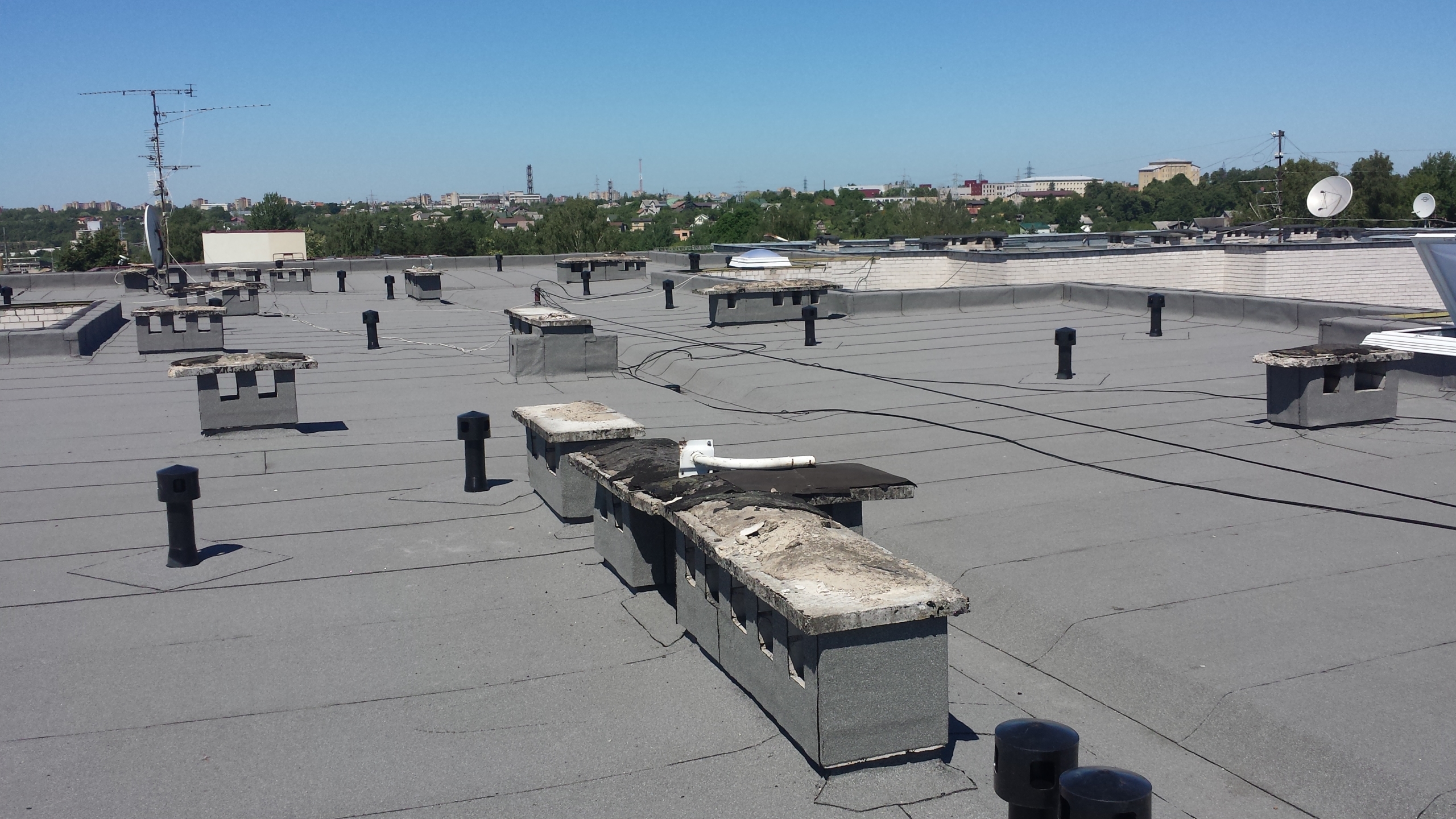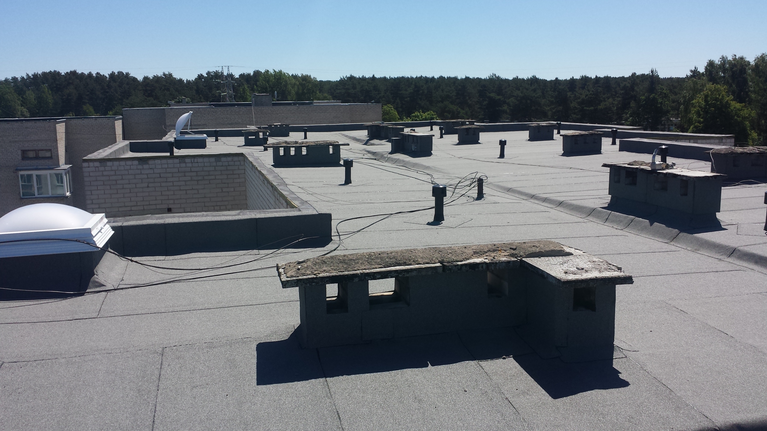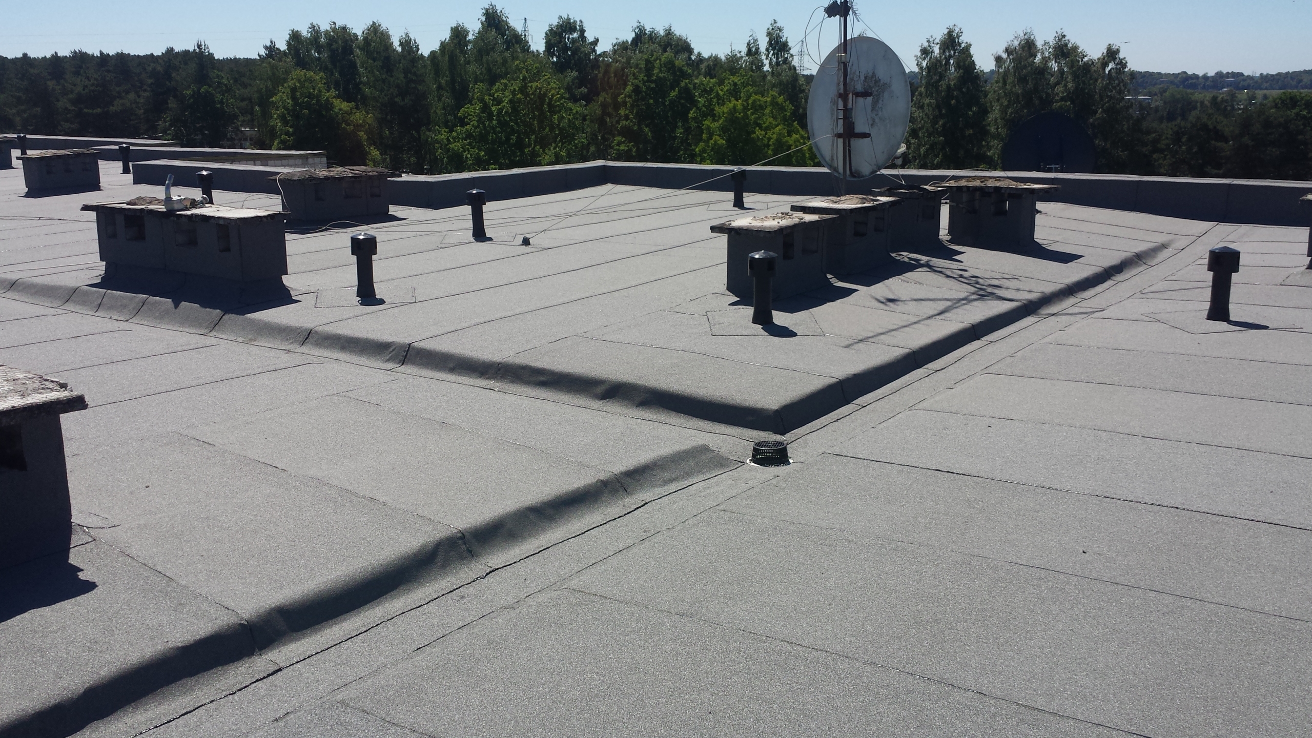 Atliekami stogo remonto-įrengimo darbai: sutapdintų ir plokščių stogų dengimas prilydoma dangą.