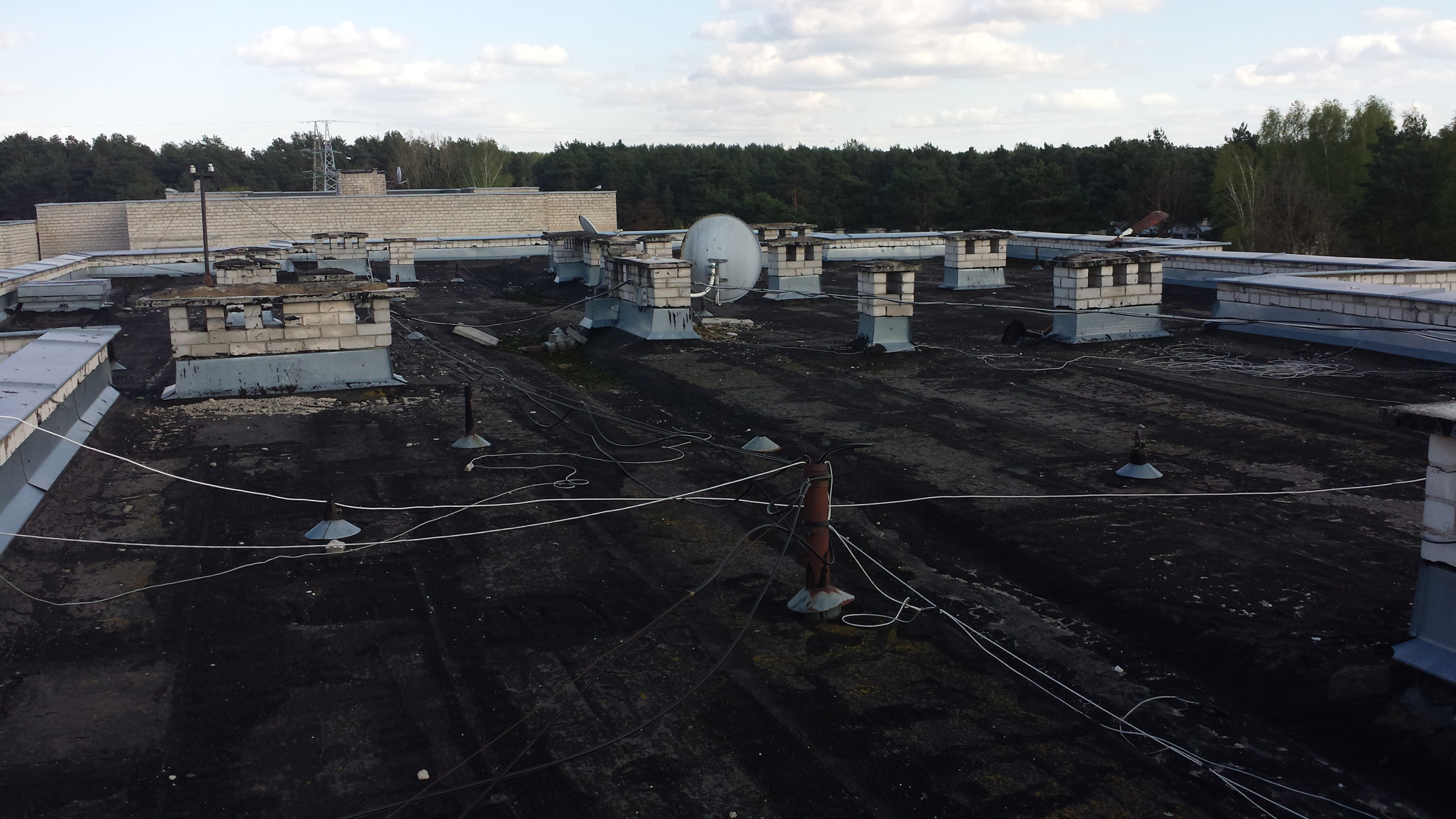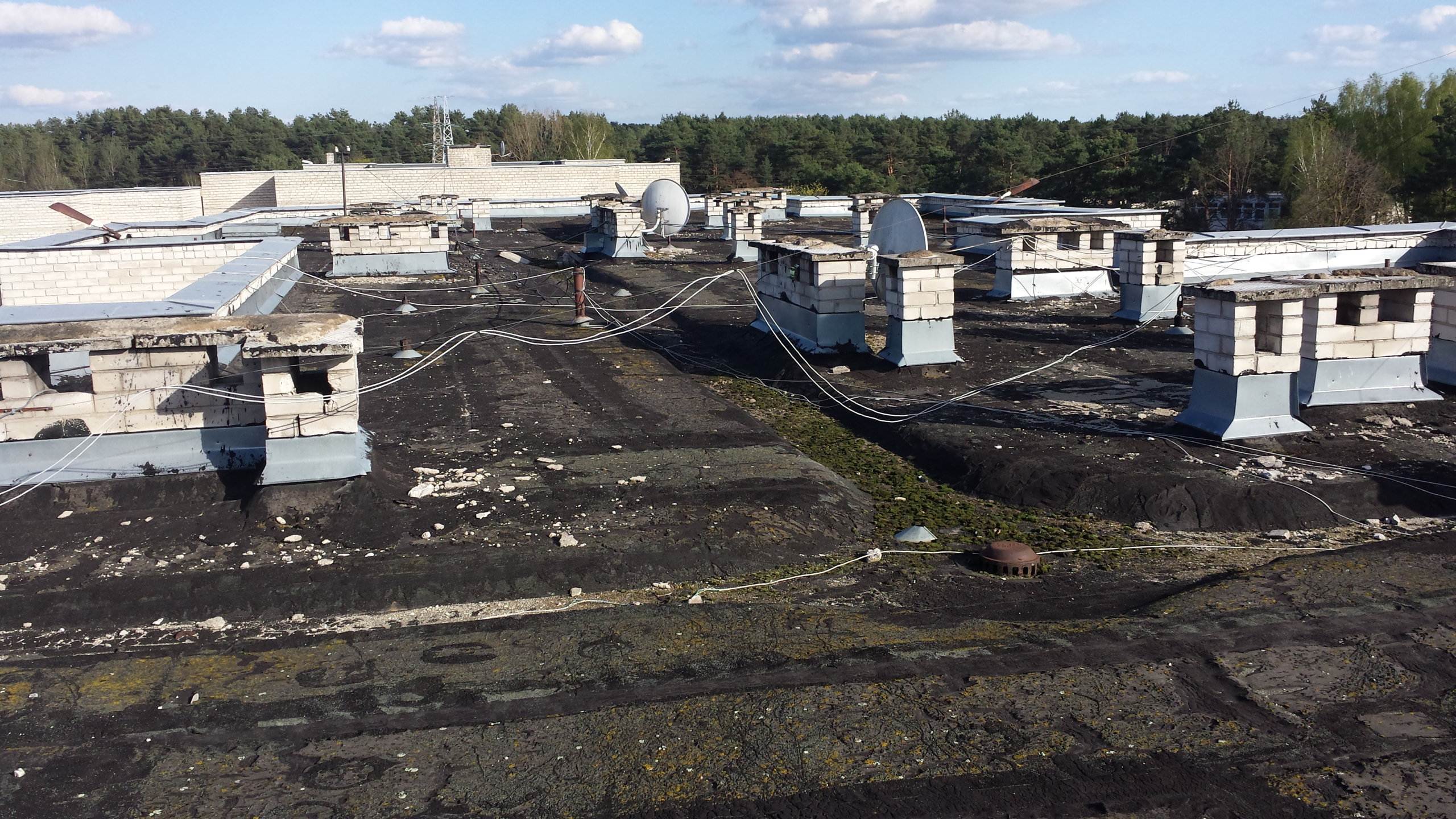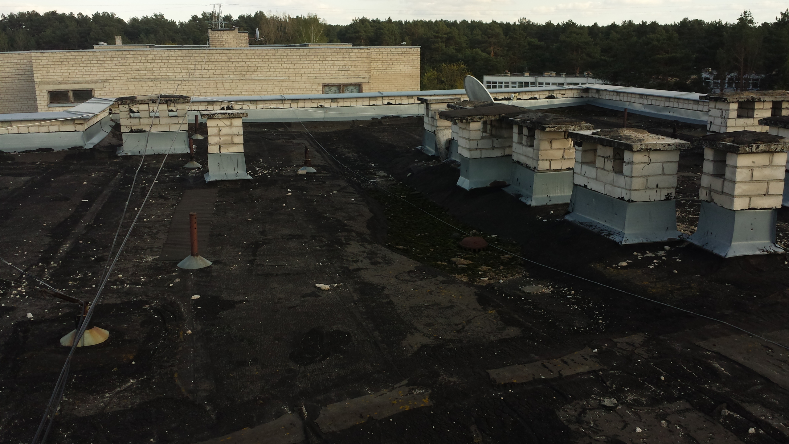 Atliekami stogo remonto-įrengimo darbai: sutapdintų ir plokščių stogų dengimas prilydoma dangą.