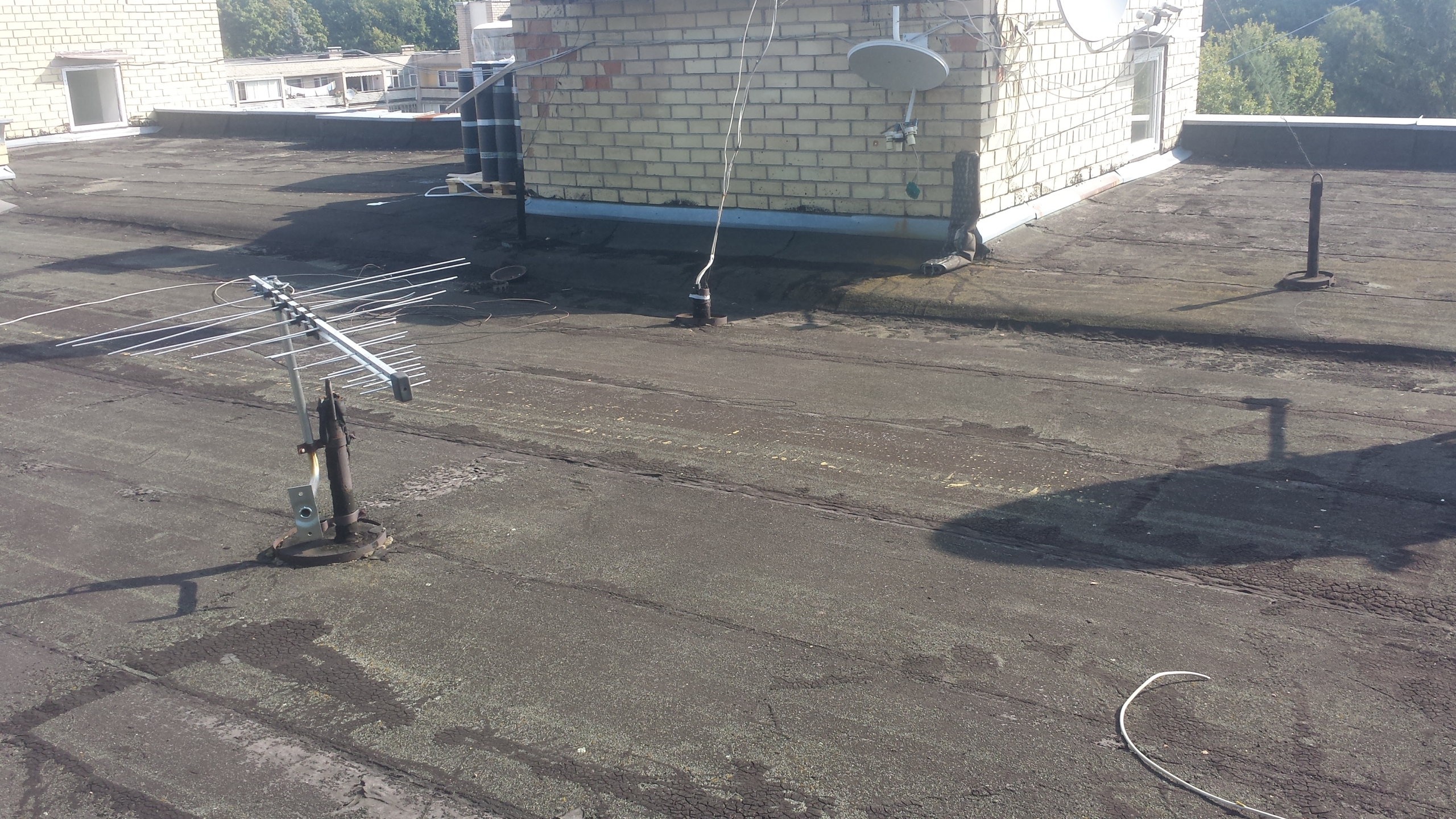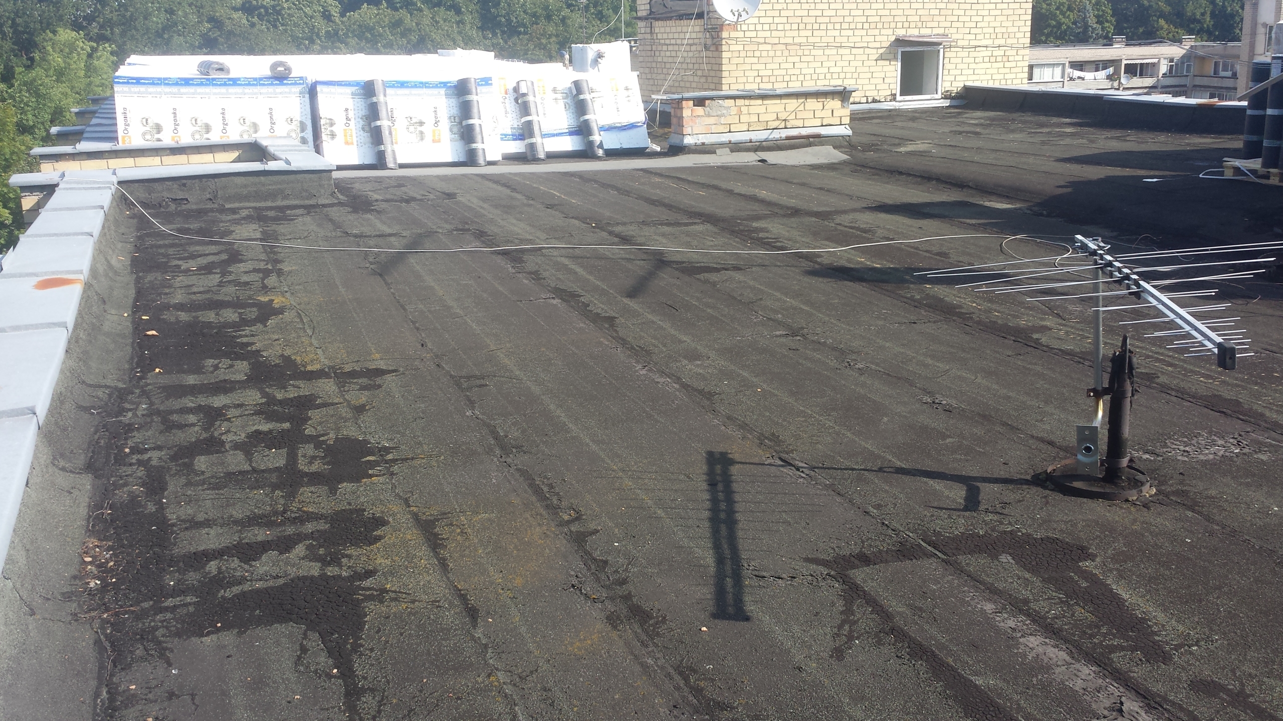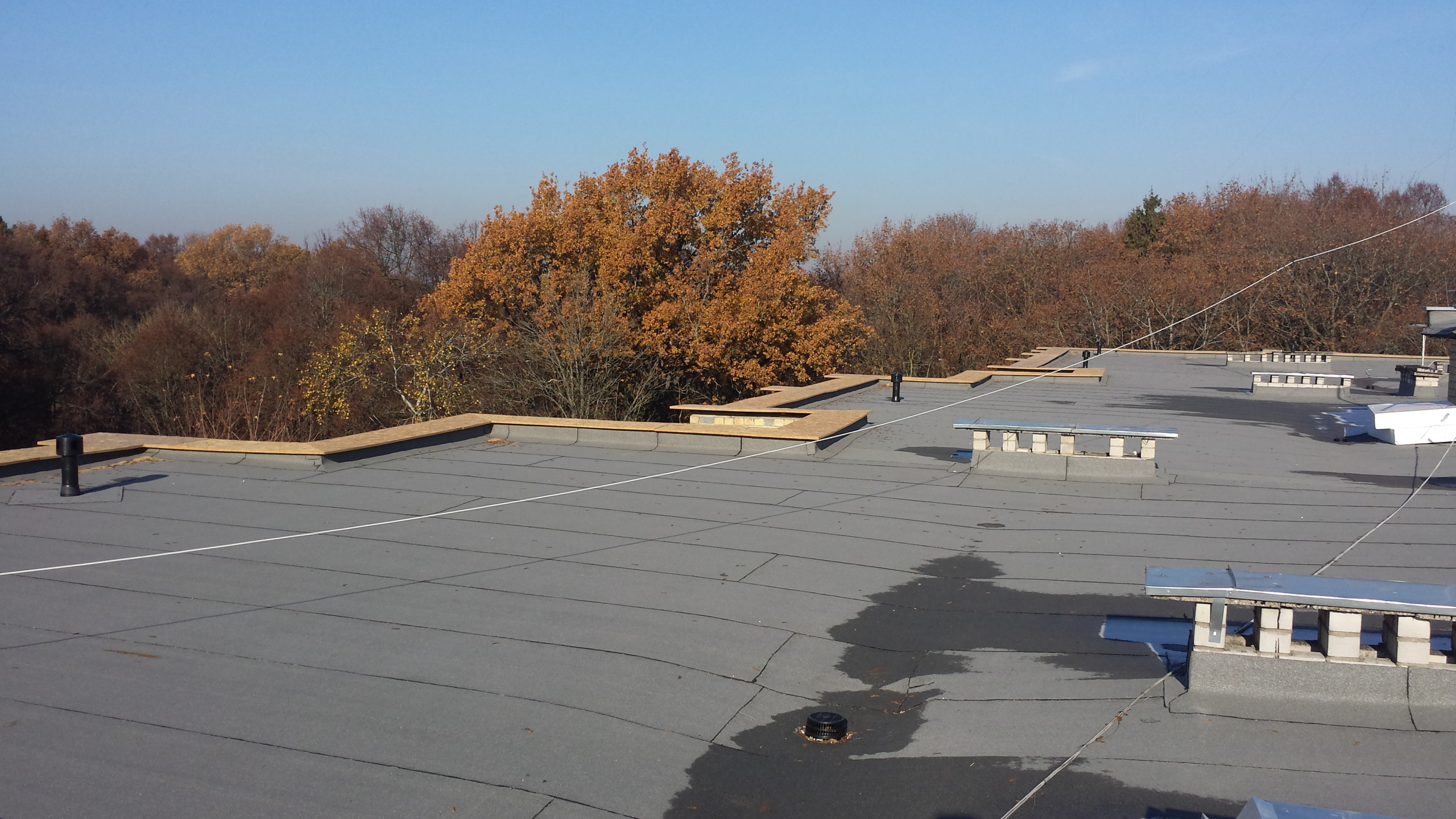 Atliekami stogo remonto-įrengimo darbai: sutapdintų ir plokščių stogų dengimas prilydoma dangą.